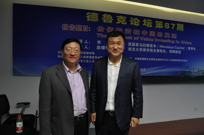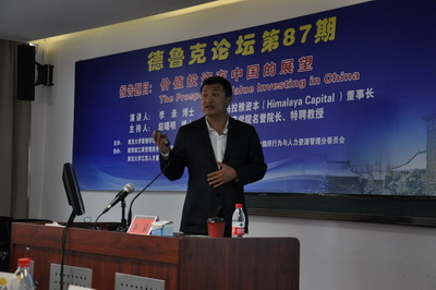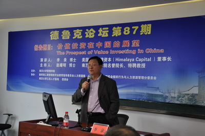 滚球买球的app官网管理学院于2015年10月24日下午3:00-5:30举行第87期德鲁克论坛,论坛主讲人是美国喜马拉雅资本董事长李录博士。这期论坛由教育部工商管理类专业教指委人力资源组、中国管理现代化组织行为与人力资源管理专业委员会、滚球买球的app官网江苏人才基地、思谋会等单位协办。企业和投资基金公司的老总、中荷EMBA学员和在校学生100多人参加了论坛。
