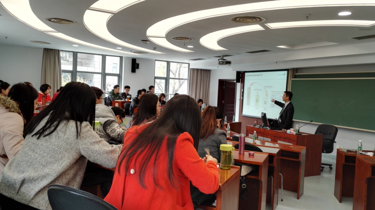 当日上午十点,在金融与保险学系孙武军老师的主持下,慕尼黑再保险公司寿险大中华区业务拓展部副总经理兼市场精算师全淼先生、慕尼黑再保险公司健康险大中华区首席精算师陈舜先生分别做了保险与再保险定价理论与实务的相关讲座。两位精算师分别从寿险和健康险的定价角度出发,介绍了传统寿险产品创新案例以及随机模拟方法在健康险定价中的应用,以优选寿险和健康险家庭保单为案例,具体而生动地深化了讲座的主题,逐渐揭开了精算师职业的“神秘面纱”。
