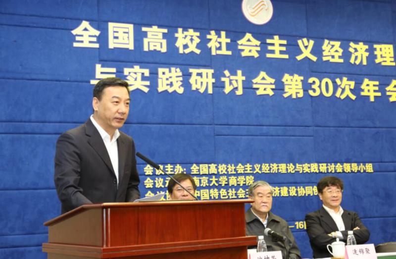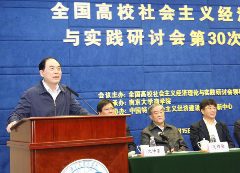 研讨会领导小组组长洪银兴教授在致辞中对研讨会作了简要介绍。他表示,全国高校社会主义经济理论与实践研讨会是由高校中从事马克思主义政治经济学研究的学者为主体志同道合集合在一起,以当时的重大改革发展问题为导向,以马克思主义经济学为基本立场,集思广益,三十多年来,不仅为建设中国特色社会主义政治经济学作出了重大贡献,而且为我国各个时期的改革发展作出了重大理论贡献。他强调,从事马克思主义政治经济学研究的学者有责任在制度自信、道路自信、理论自信和文化自信的基础上构建中国特色社会主义政治经济学理论体系。他特别指出,作为第30次年会,与会学者要在研讨中贯彻百花齐放、百家争鸣的精神,多提建设性意见,体现研讨会的水平与学者的学术研究深度,反映我国高校马克思主义经济学研究的最新科研成果。