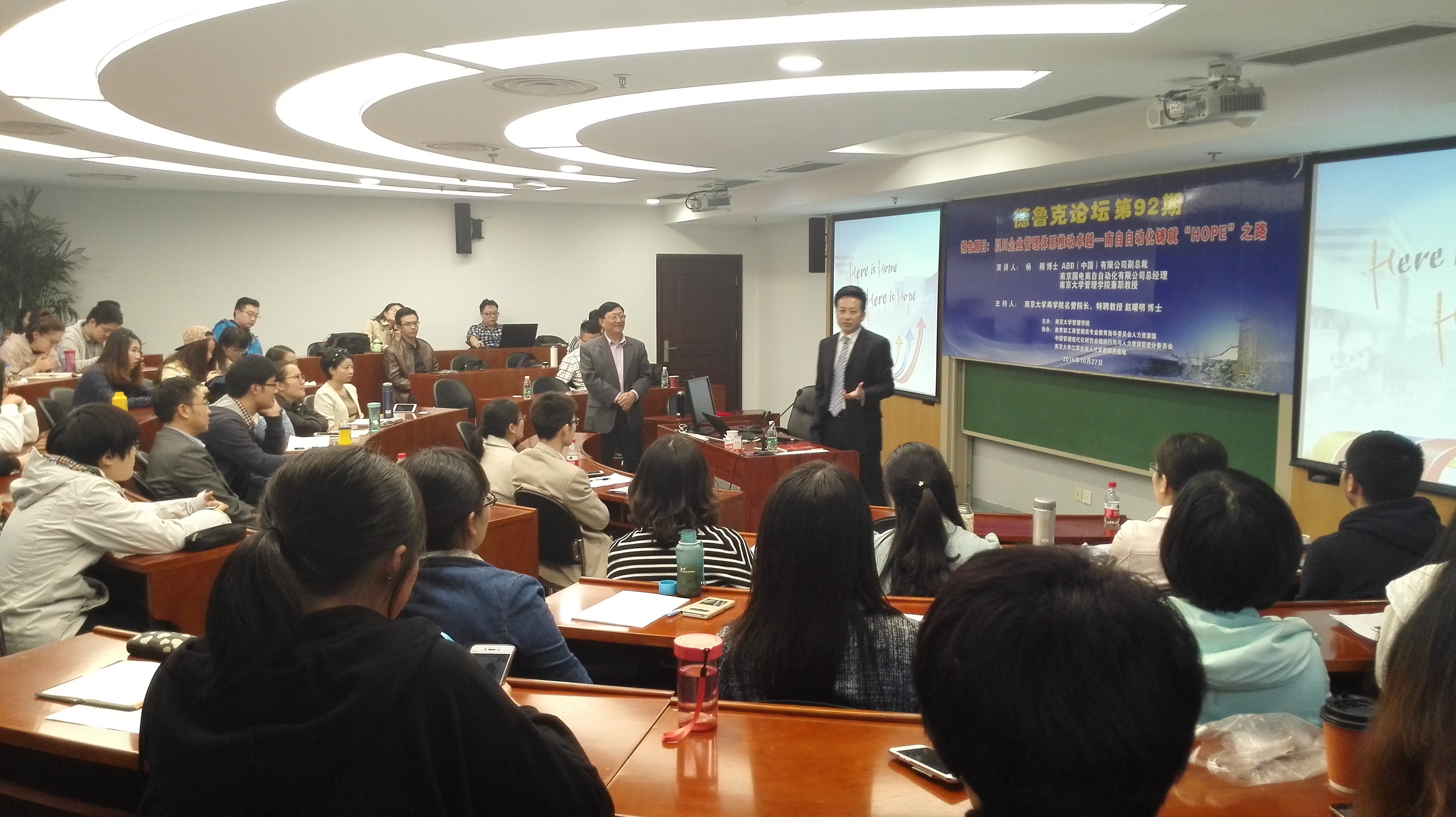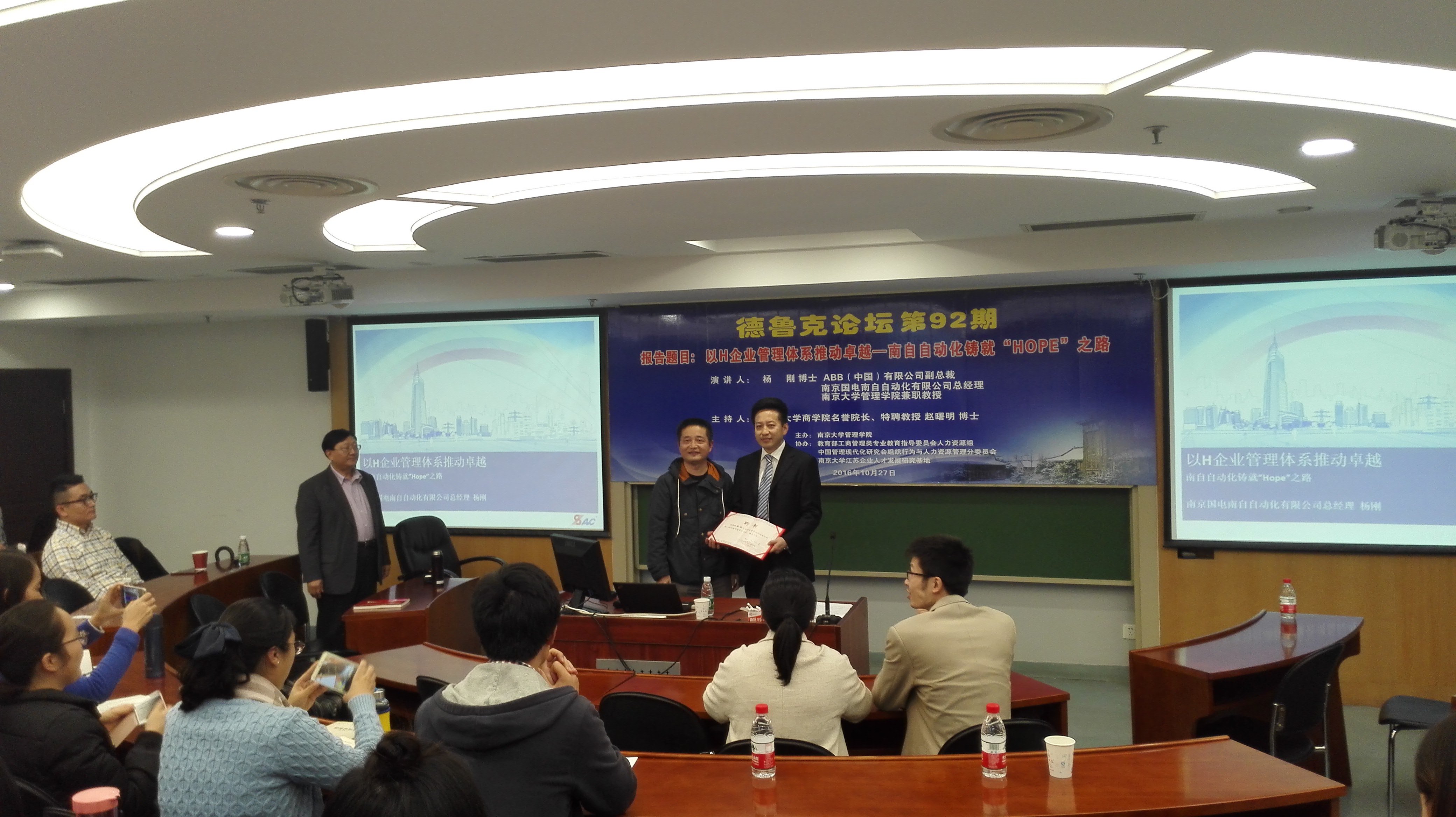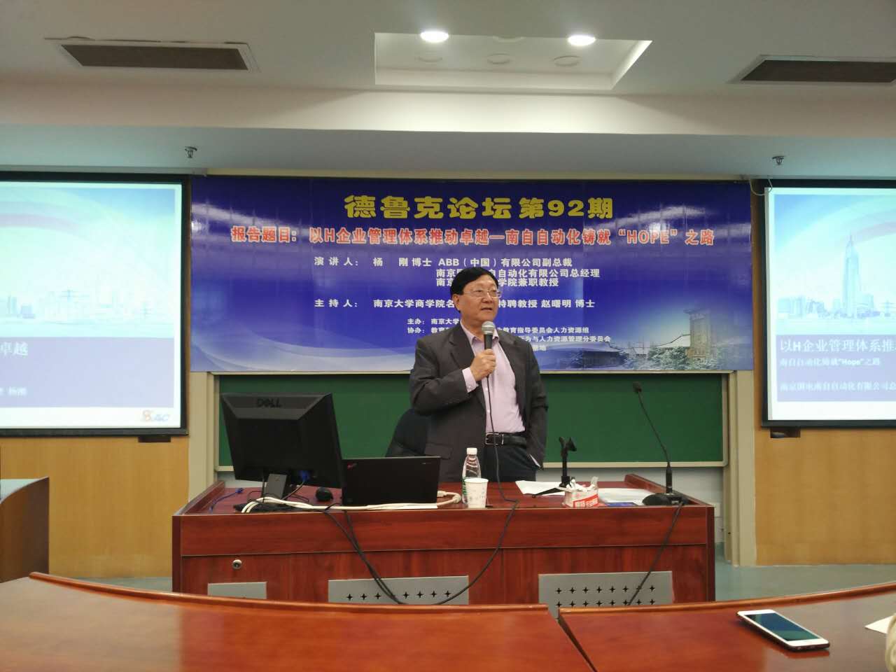 2016年10月27日15:30,第92期德鲁克论坛:以H企业管理体系推动卓越—南自自动化铸就“HOPE”之路,在滚球买球的app官网301教室如期举行。此次德鲁克论坛由滚球买球的app官网管理学院主办,教育部工商管理类专业教育指导委员会人力资源组、中国管理现代化研究会组织行为与人力资源管理分委员会、滚球买球的app官网江苏企业人才发展研究基地协办。ABB(中国)有限公司副总裁、南京国电南自自动化有限公司总经理杨刚博士应邀分享了南自的H管理体系如何铸就‘HOPE’之路并推动卓越的历程,滚球买球的app官网名誉院长赵曙明教授主持了此次论坛。