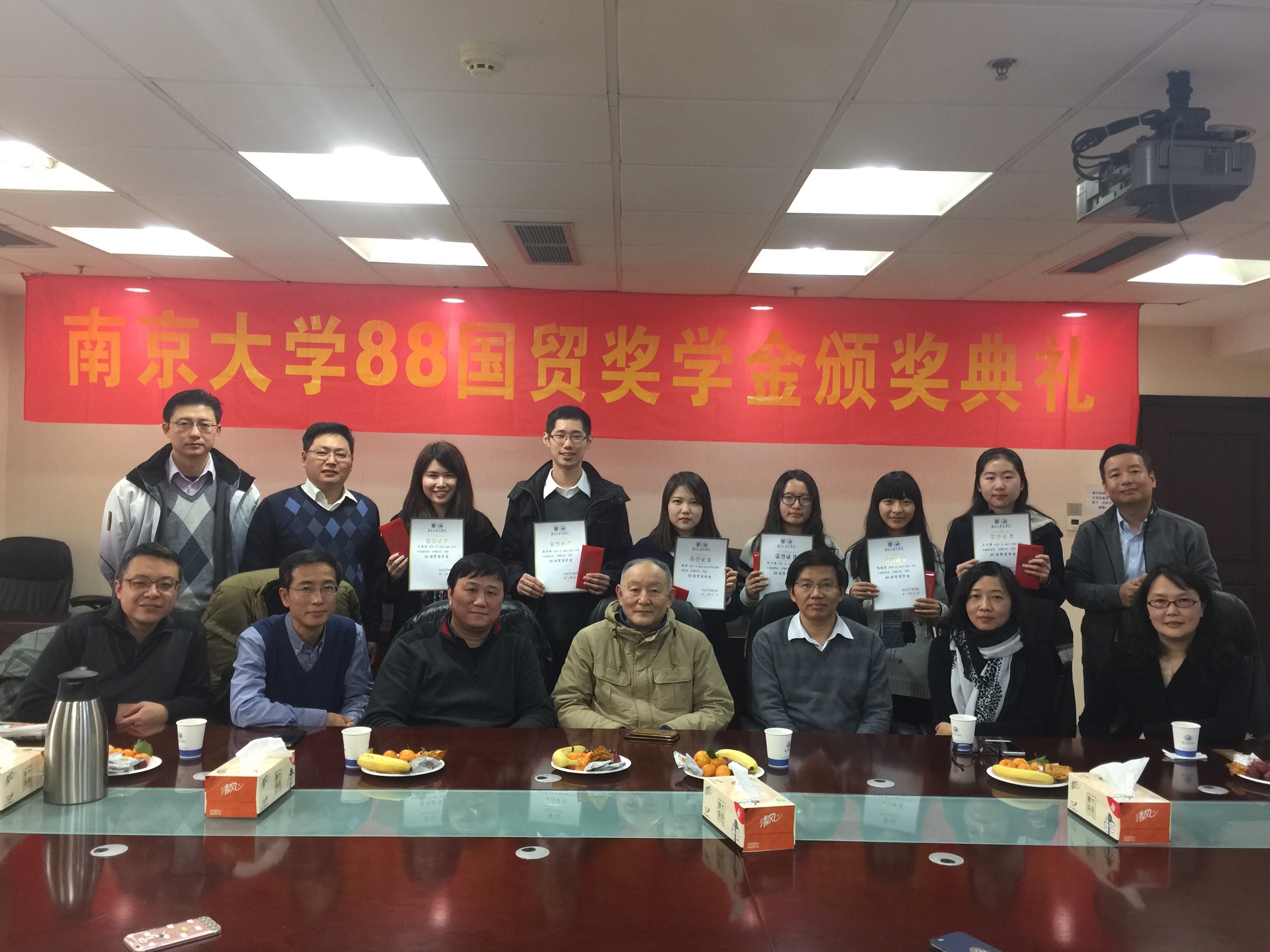 “88国贸奖学金”是由国际经济贸易系88级本科校友于2007年毕业15周年时自愿捐资设立的面向国际经济贸易系2—4年级在校本科生的高额奖学金,每次奖励6名同学。奖励对象由88级10名校友组成的奖学金评选委员会经过严格筛选、面试产生,主要奖励各方面全面发展、有特长及强烈社会责任感或进步显著的学生。本届奖学金共有许肃照等6名同学获奖。88级国贸陈旻先生、柏晓红女士等7位校友代表,国际经济贸易系主任马野青教授、党支部书记方勇副教授及时任授课老师赵曙东教授出席了颁奖仪式。该奖学金至今已颁发9届。