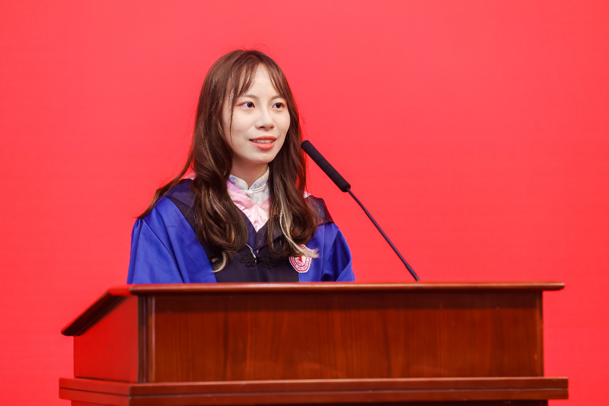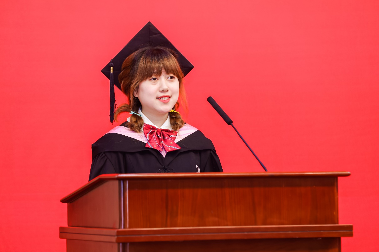 毕业生代表、2022届西方经济学专业硕士研究生刘探宙同学回顾了三年的研究生生涯,她表示,“南大教给我们了知识,教会了我们怎样做人,我们已经有底气勇敢地走出去,我们已经有理由成为一个诚朴逐梦、励学进取的人,成为一个能够勇敢面临现实挑战、追寻目标肩负社会责任的人”,祝愿全体毕业生前程似锦、工作顺利、人生幸福,同时祝愿学校和学院蓬勃发展、蒸蒸日上。