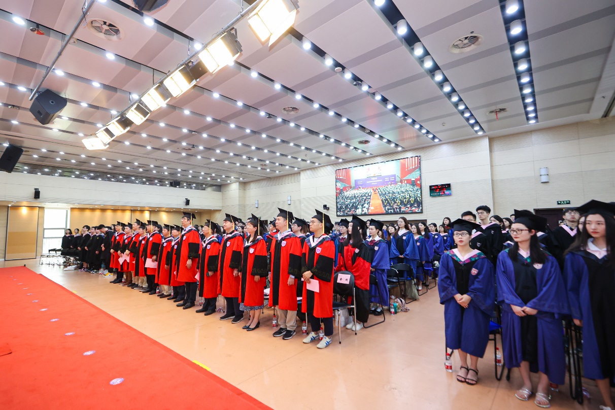 典礼开始,全体师生观看了学校主会场毕业典礼直播。主会场上,校党委书记胡金波寄语2022届毕业生“生逢其时,应不负盛世;生逢其时,当奋斗其时”,希望毕业学生无论走到哪里,都要牢记习近平总书记的殷殷嘱托,心系国家事,肩扛国家责,赓续“宽德养士,至乐成学,吾道在国,与世恒新”的南大精神。校长吕建作了题为“华章续新篇,云程再发轫”的主题讲话,并向同学们提出了四点期望,一是要发扬报国传统;二要锤炼品德修为;三是要提升本领才干;四要坚持砥砺奋斗。滚球买球的app官网2022届会计学专业本科生王湛鑫同学作为全校本科生代表,在学校主会场毕业典礼上发言。