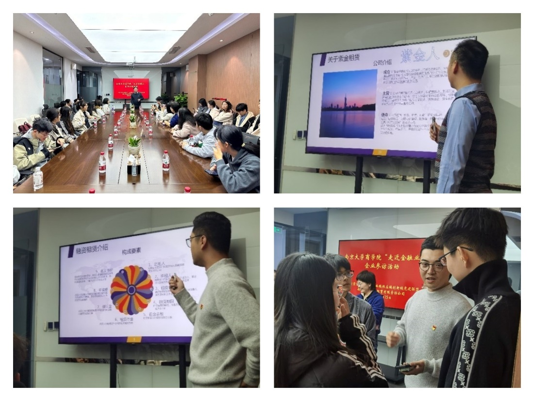 第三站,师生来到紫金融资租赁公司。在公司董事长丁萌先生简要介绍了企业概况后,业务部经理王亚先生介绍了融资租赁这一金融工具的核心构成要素、业务模式、盈利方式和行业发展,为尚未系统了解过融资租赁的同学们上了一堂内容丰富的实践课。随后,业务部经理杨尧先生介绍了资金租赁在行业中的地位、股东信息、股权构成等情况。同时,他也以生动的比喻阐释了紫金集团的企业文化:如同南大的同学们以“南大人”自称,紫金投资集团的工作者也以“紫金人”自称,并以共同的期许和目标要求自身,力求建设更强大的紫金。杨经理指出,国内融资租赁行业正处于行业的发展上升期,未来发展空间巨大,欢迎同学们在择业时考虑从事融资租赁行业的金融机构,紫金租赁热烈欢迎同学们的申请。同学们也就融资租赁行业的行业竞争、工作压力、就业岗位等情况与两位经理展开了交流。