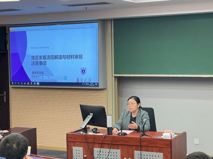 党委秘书、专职组织员胡春妮就党员发展工作中的各个环节以及发展材料审核做了详细解读,并结合学校规范和要求,针对日常工作中的痛点、难点向与会成员介绍了重点关注事项,对下一阶段的党员发展工作进行了介绍。她希望党支部书记切实担负起党建工作第一责任人的职责,坚持抓在经常、严在日常,严格党员发展工作流程和工作纪律,牢牢做到不变形、不走样,进一步提升学生党员发展质量。
