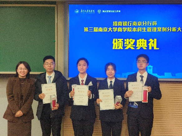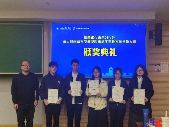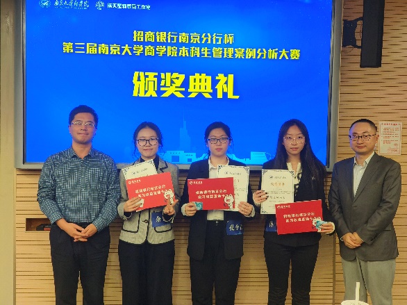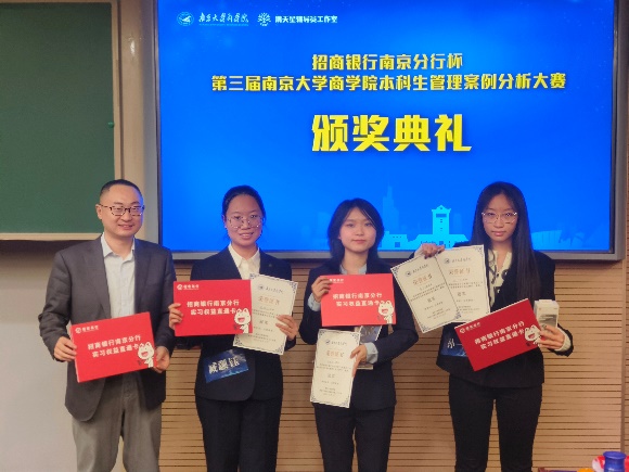 经过激烈的比拼,由黄子珊、黄靖雯、孙一宁、臧灏钰组成的“The Phoenix Four队”夺得大赛冠军;由戴耿喆、孔令萱、陈兴炜、韩睿盈组成的“ROWP”荣获亚军;由余雨茜、赵银烁、王晨、黄璇组成的“蒙的全队”荣获季军;由章梓恒、王立、唐一、李想组成的“取个啥名队”荣获优胜奖;孙一宁、孔令萱、余雨茜三位同学荣获最佳风采奖。“Lumisight”、“跑的回归都显著队”、“N-Zone队”、“吃饭不排队”、“三佬带一傻队”、“从容应队”荣获十强队伍。茅宁、王宇伟、刘海建、吴舒、龙政华为获奖选手颁奖,余力为冠军团队与最佳风采奖获得者颁发招商银行南京分行实习offer。