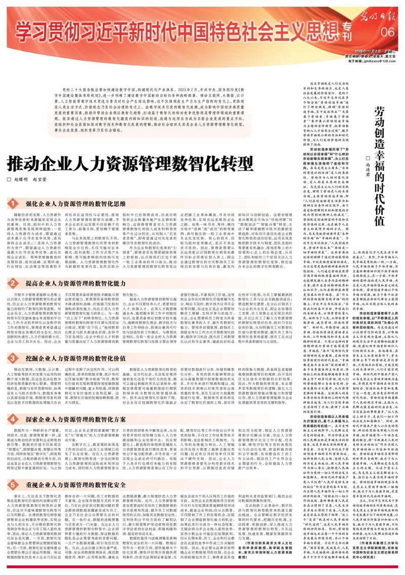 党的二十大报告提出要加快建设数字中国,构建现代化产业体系。2023年2月,中共中央、国务院印发《数字中国建设整体布局规划》,进一步明确了建设数字中国新的目标任务和战略部署。移动互联网、大数据、云计算、人工智能等数字技术更迭与普及对社会产生深远影响,这不仅体现在生产力与生产结构的变化上,更体现在人类生活方式、价值观念乃至社会治理的变迁上。由数字技术引发的数智化浪潮,成为影响中国经济高质量发展的重要因素,鼓励并帮助企业顺应数智化趋势、打造基于数智化的相对竞争优势将是管理学领域的重要课题。能否通过人力资源管理的数智化激发内部知识的创造、流通与运用应当成为目前企业发展的重点方向。在组织和社会层面加深对数字技术和数智化发展的理解,推动社会组织尤其是企业人力资源管理数智化转型,事关企业发展、组织变革乃至社会福祉。
