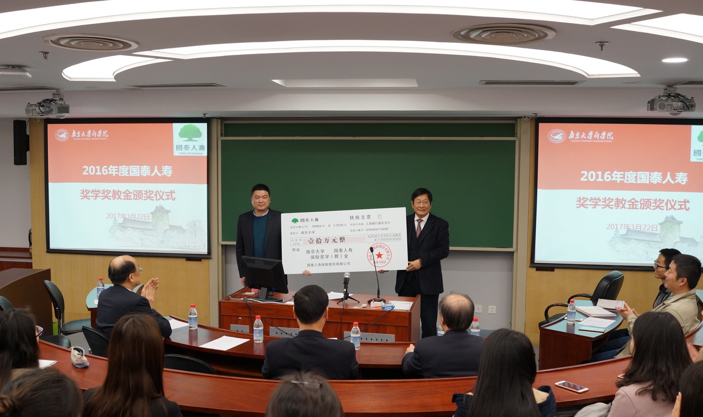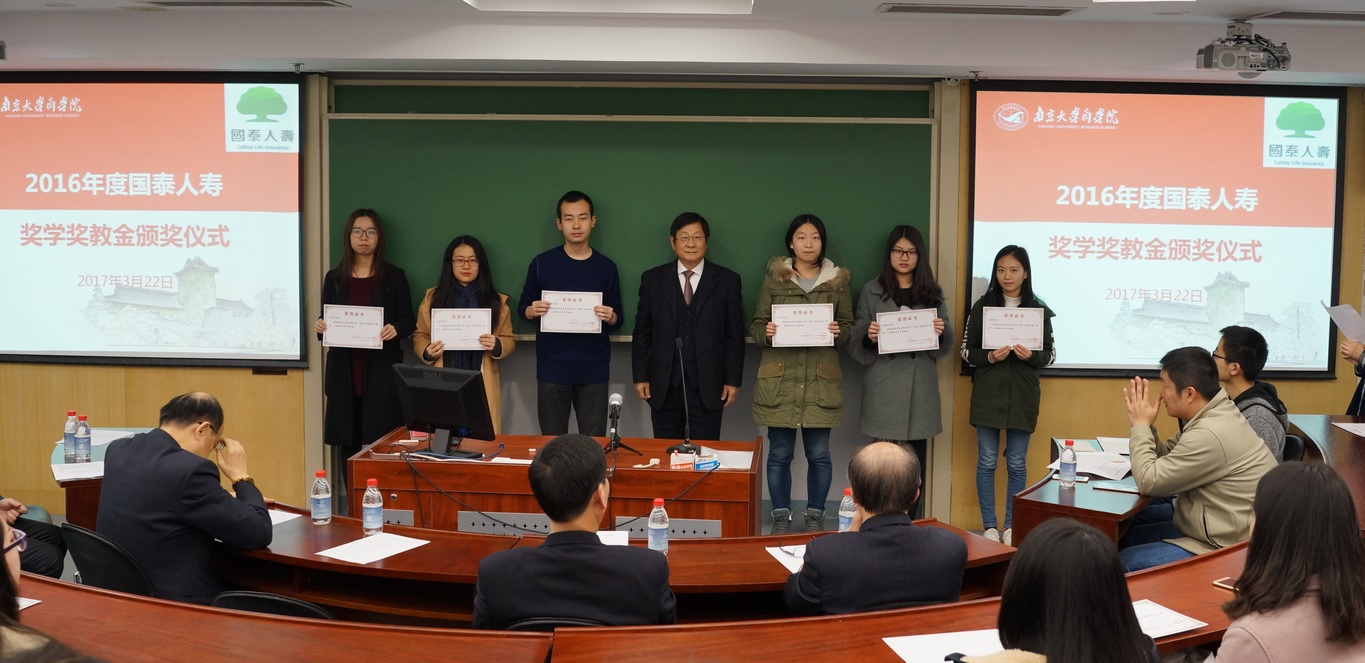 “国泰人寿奖学奖教金”由台湾国泰人寿保险股份有限公司于2006年5月在南大捐资设立,每年捐赠10万元奖助金融与保险学系的本科生、研究生和老师。时至今日,国泰人寿奖学金已经成功举办了11届,获奖师生人数已过500人。