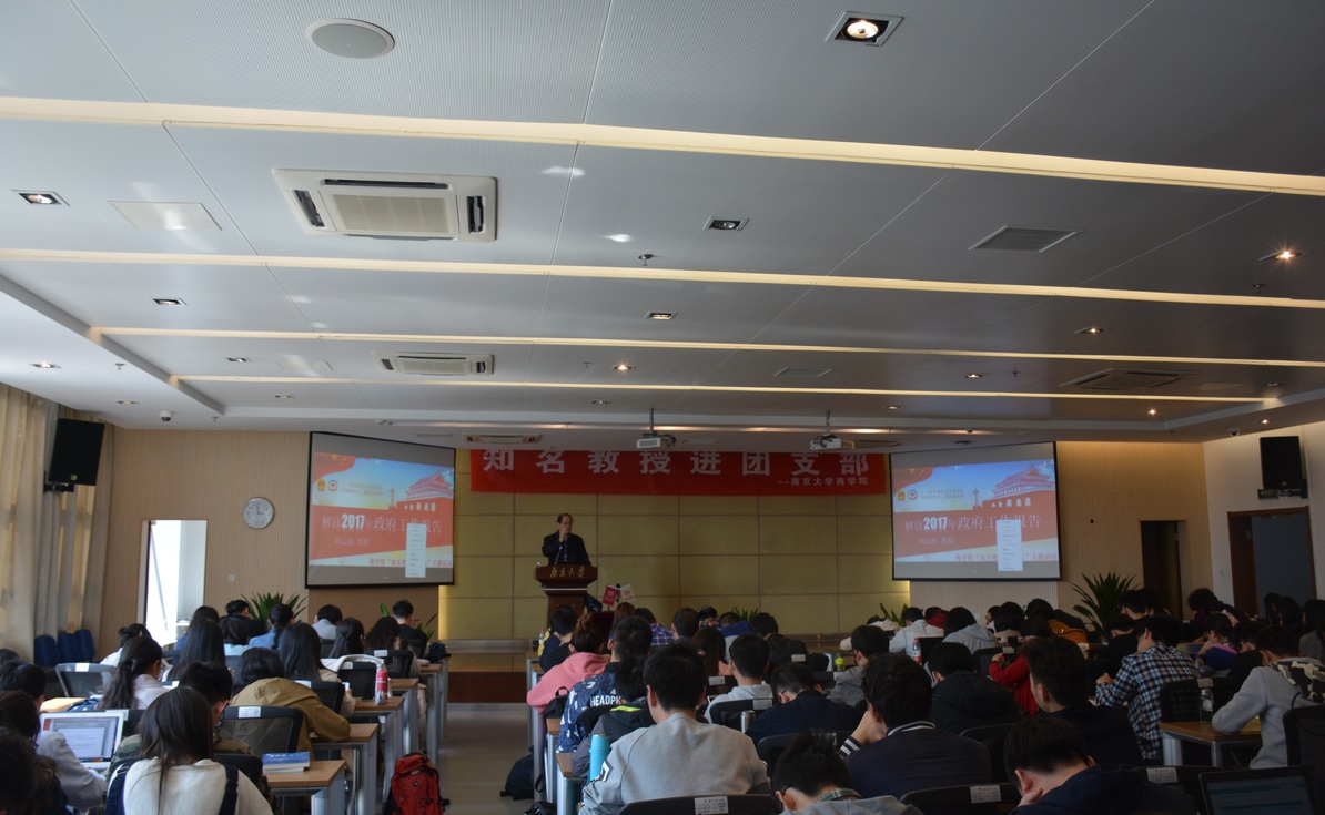 为了贯彻落实“立德树人”的根本任务,夯实基层团组织建设,让广大同学成为具有高尚的道德素养,宽厚的知识储备,敏捷的思辨能力的新时代青年,4月13日,滚球买球的app官网响应校团委号召,举办“知名教授进团支部”特色团日活动。活动有幸邀请第十二届政协委员、滚球买球的app官网产业经济系刘志彪教授为同学们解读《政府工作报告》。滚球买球的app官网党委副书记吕亚红老师、各年级辅导员出席活动,滚球买球的app官网仙林本科生党支部、16级各团支部的同学参加了此次活动。