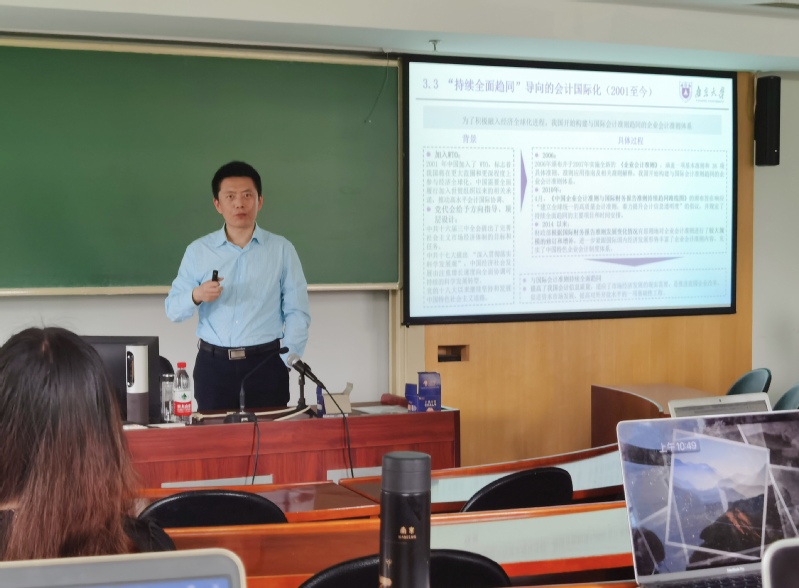 王兵副教授的讲座主要从四个方面由浅入深地为大家介绍了新中国成立以来我国的会计制度变革史。第一部分,王兵副教授从会计制度的相关概念入手,在广义和狭义两个角度阐释了会计制度的内涵。并简单介绍了会计中基础的“四表一注”和15世纪起源的复式记账法。第二部分,王兵副教授为大家解释了现如今主要的会计制度,并详细阐述了不同会计制度的区别以及它们各自的修正修订史。第三部分是讲座内容的重点,王兵副教授将新中国成立以来的会计发展史分为三个阶段,分别为会计制度的建立与曲折发展(1949-1977)、适应市场经济的统一会计制度模式(1978-2000)、“持续全面趋同”导向的会计国际化(2001至今)。王兵副教授将我党历史重要节点与会计制度的变革联系起来,让大家对这种改变有了更加形象立体的认识。最后一部分,王兵副教授基于前面的阐述,给出了相应的启示。他认为,要从整体观看中国会计制度的发展,要始终明白会计制度必定是服务于经济制度的,在未来会计制度也需要不断完善和修正,我们要坚持理论实践结合,扎根本土和兼收并蓄相辅相成。王兵副教授用简明扼要的总结,把新中国成立以来的会计制度变革史生动地呈现在同学们面前,赢得了同学们阵阵掌声。