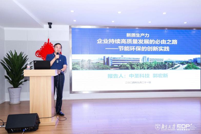 随后,中圣科技董事长郭宏新先生带来以“新质生产力,企业持续高质量发展的必由之路——节能环保的创新实践”为题的讲座。郭董事长深入浅出地阐述了对新质生产力的理解,强调了其在推动企业转型升级、实现绿色高质量发展中的关键作用。他结合实例,分享了公司在节能环保领域的深度探索与实战成果。