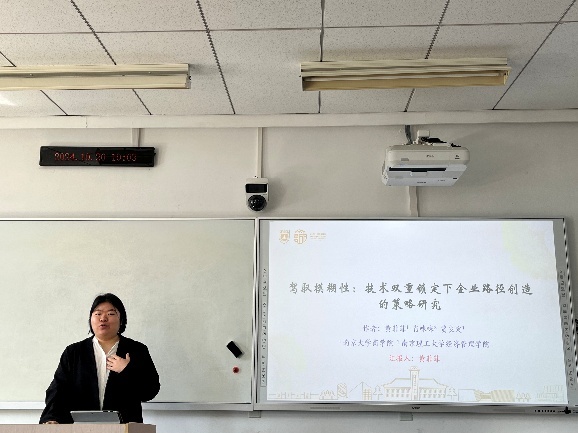平行论坛3的主题是“组织变革”,地点择善楼305。华东理工大学万倩雯老师聚焦一家进入中国农村市场的企业社会创业者的具体行动策略,采用纵向单案例研究方法,探究其从最初的制度迁就到推动非正式与正式制度在农村市场的制度共生,直至实现经济与社会价值共创的过程。大连理工大学博士研究生胡严方以君智战略咨询的持续性变革过程为研究对象,采用嵌入式案例研究,构建组织权力悖论结、识别偏移趋势并挖掘再平衡实践,探讨了持续性组织变革中权力悖论结的耗散均衡演化机理。南京理工大学肖咪老师以一家国有企业的战略转型为案例,深入探讨了国有企业在悖论张力与身份变革中的双重建构路径,揭示了悖论与身份之间复杂的相互塑造机制。中山大学吴小龙助理教授基于组织逻辑变革视角,通过对美的集团2012-2023年从制造型企业到科技型企业的跨越式转型进行纵向案例研究,揭示了制造企业跨越式转型过程中组织逻辑演变的微观机理。大连理工大学林海芬教授、英国纽卡斯尔大学李鑫副教授、中山大学吴小龙助理教授、华东理工大学万倩雯老师以及南京理工大学肖咪咪老师进行了热烈地论文讨论。
