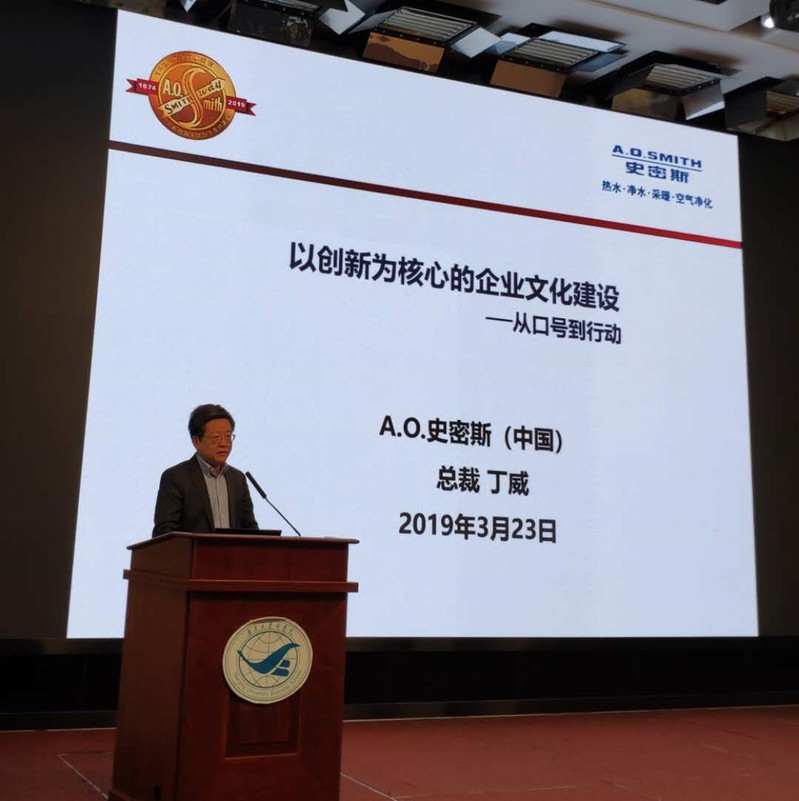 A.O.史密斯集团公司高级副总裁兼中国公司总裁丁威先生进行了主题为“创新为核心的企业文化建设--从口号到行动”的演讲。丁威先生提出,20多年的传承与发展体现了A.O.史密斯集团独有的企业文化——严守商业道德,不断创新。简单来说就是“四个满意”:客户满意、股东满意、员工满意、社会满意,这已成为衡量员工在工作中的每一个行为的标准。同时,丁威先生指出要把A.O.史密斯公司这145年的经营哲学和经营传统落地,主要在于敢于创新,敢于进入新品类,前提是要有核心技术,靠技术占领市场。