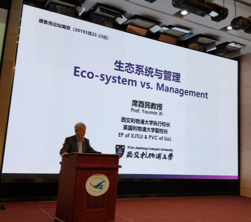 西交利物浦大学执行校长、英国利物浦大学副校长席酉民教授作了主题为“生态系统的领导与管理”的演讲。席教授论述了进化和演化的区别,也提出了很多需要思考的问题,如生态化的组织如何管理,生态系统演化对人类组织的演化的启示是什么等。同时,他提出未来社会的“九大生存原则”:涌现优于权威,拉力优于推力,指南针优于地图,风险优于安全,违抗优于服从,实践优于理论,多样性优于能力,韧性优于力量,系统优于个体。