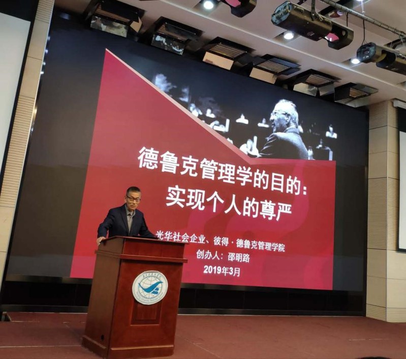 彼得·德鲁克管理学院创办人、光华社会企业集团主席邵明路先生从个人和企业两个角度作了题为“德鲁克管理学的目的,实现个人的尊严”的主旨演讲。邵先生指出,每个人都有自己潜在的特殊价值和才能以及良知,别人无法替代,通过妥善管理和学习,能让他们彰显出人性和尊严,正如德鲁克教授提出的:领导,就是把人的愿景拓展到一个更高的层次,把人的绩效提升到一个更高的标准,使人的品格超越他通常的限制,才能使各种组织机构负责任的独立自主的,高绩效的运作,也是每一个人自由和尊严的唯一保障。此外,在谈到“狼性文化”和末尾淘汰时,邵先生表示他并不完全认可,因为人不是工具,不能被当做工具对待。他认为企业的目的是造就顾客,管理的目的则是在这一创造性工作的过程中,实现个人的尊严。